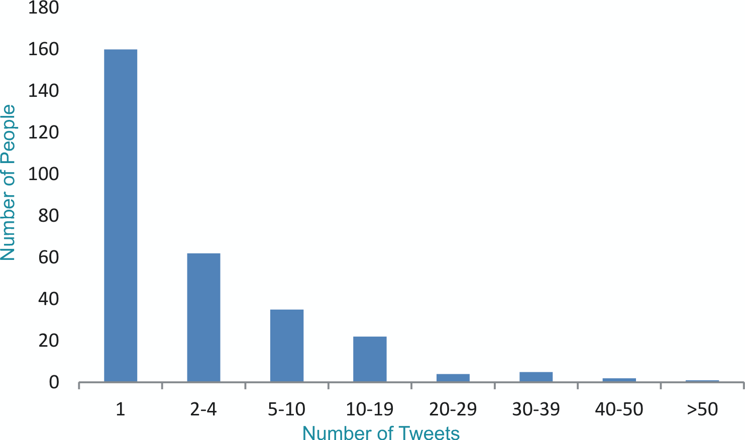 Of the 1292 tweets 77.8% (1006) were original tweets and 22.2% (287) were retweets (comments thought to be worth repeating, identified with the prefix RT).