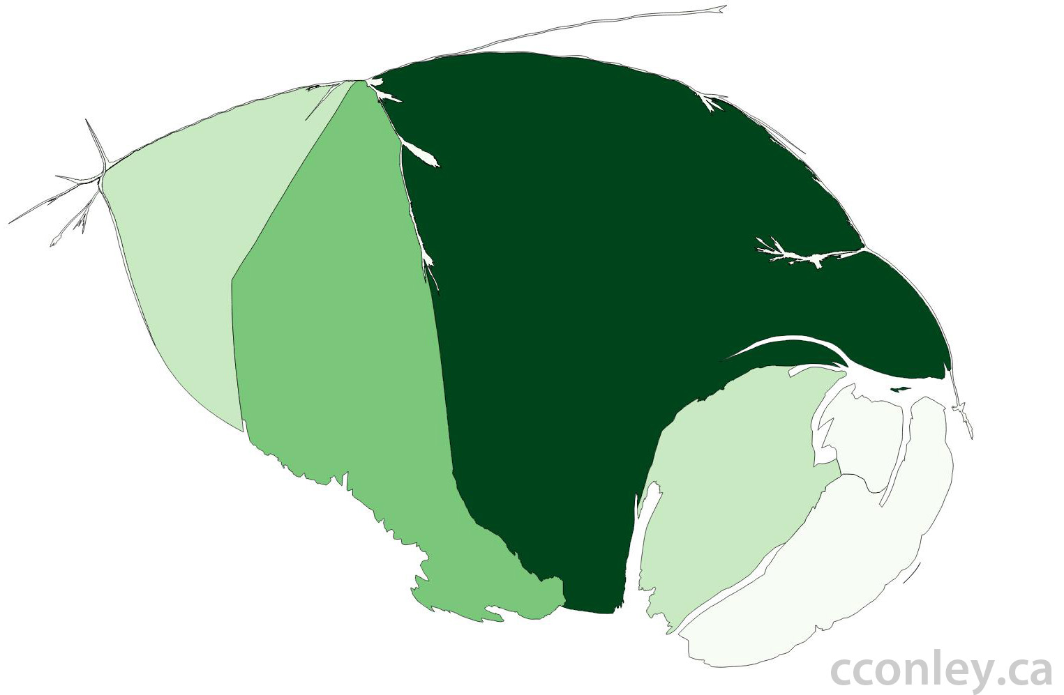 Cartograms are not restricted to population or frequency data and can be developed using any numeric data that relates to a geographic location. The green cartogram below presents the provincial and territorial boundaries from the perspective of equalization payments. Equilization payments are made by the federal government to the provinces in an attempt to address “fiscal disparities.” Regions that receive equalization payments have often been referred to as “Have-not” provinces. Using information for 2012-2012 shades of green have been used to describe the level of payments each region receives with dark-green representing the largest payments, light green the smallest payments and white representing no payments. Like the last cartogram, the size of the provinces complements the green scale with the largest provinces receiving the largest payments and smaller provinces receiving less. Here we see that Quebec receives the largest payments with the western provinces and territories receiving nothing.