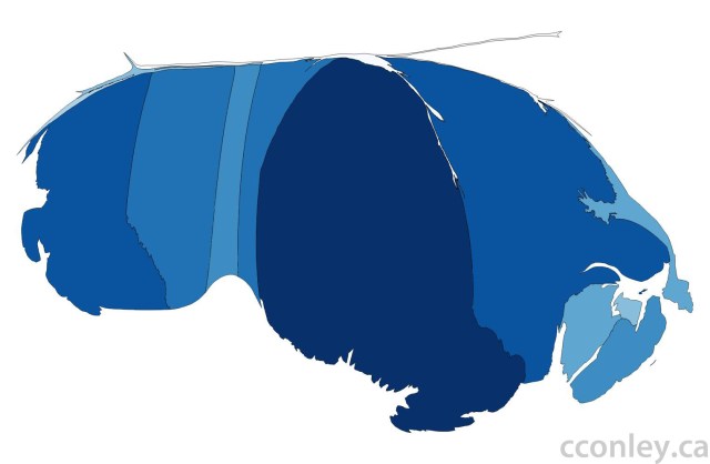 Resizing and reshaping the geographies of provinces and territories to describe population size provides a startling view of the country. In this cartogram, high population density, like Ontario and Quebec, is reflected in a dark blue boundary that appears to have been inflated like a balloon. Low densities, like the Territories, are light blue with deflated or constricted boundaries that look like ribbons.
