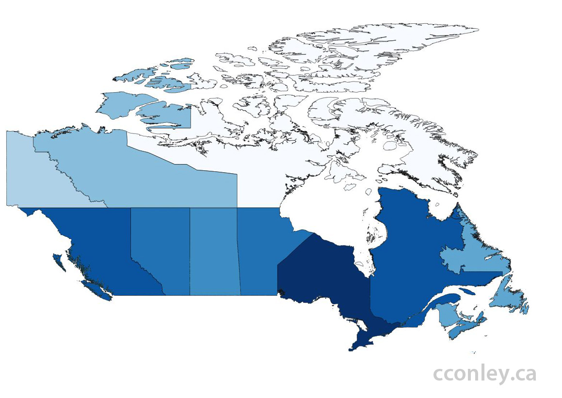 In this map of Canada the population density from the 2011 Census is described as a blue colour scale. The largest population is dark blue with lighter shades reflecting smaller populations. Here we see Ontario has the largest population and Nunavut has the smallest (click on the image for a larger version).