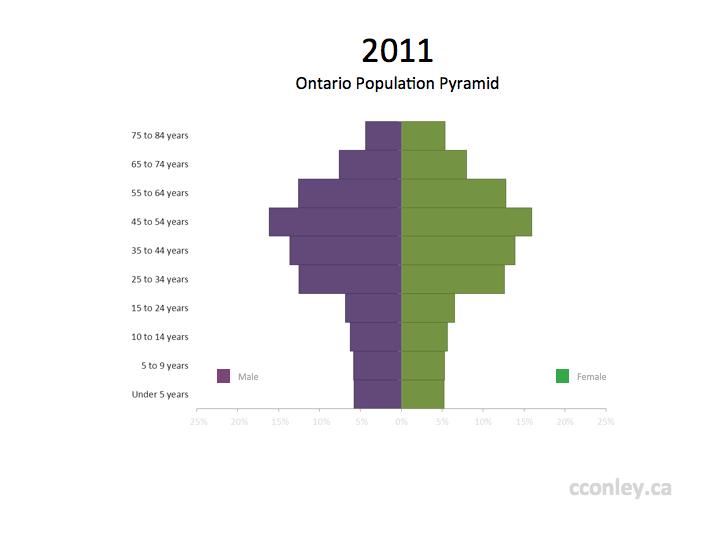 Statistics Canada has released the Age and Sex data set for 2011. A traditional visualization for this kind of data is the population pyramid. The population pyramid is a modified version of a stacked bar chart with the division between categories centered around 0. You may notice that this population pyramid for Ontario, using the 2011 census, looks more like a tree than a pyramid. One of the reasons for this is that the youngest categories have been divided into 5 year ranges whereas the adult ages are divided into 10 year ranges.