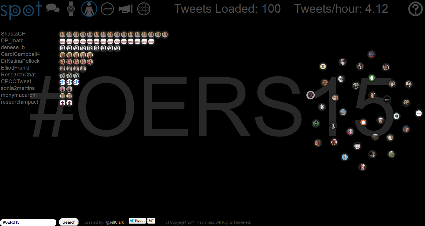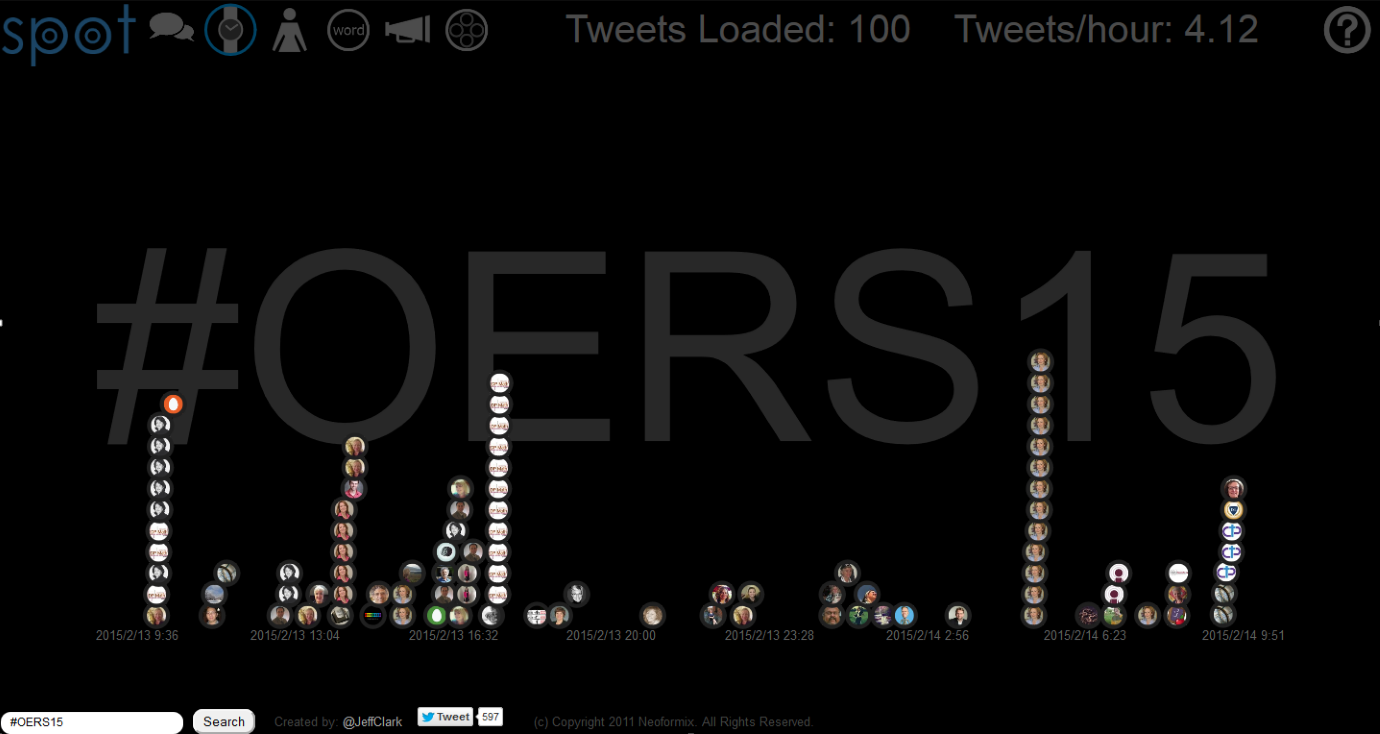 Following is a quick overview of the tweets, comments on some twitter utilities and a look at a non-traditional approach to twitter analysis. An excel version of the archive is available here (includes some additional summary fields) and the live archive can be accessed here (the archive will be left open for a while to get a sense of how long #OERS15 material circulates).